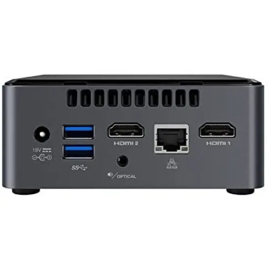 The NUC June Canyon Celeron Mini PC (Tall) from Intel is designed to aid your productivity with a compact and portable computer that’s equipped with a 2.0 GHz Intel Celeron J4005 dual-core processor. This mini PC also houses 4GB of DDR4 memory and 32GB of eMMC storage for all your multitasking and data management needs. In addition to speedy performance, the Celeron J4005 processor is equipped with 4MB of cache memory and has a thermal design power of 10W. The NUC 7 Essential supports integrated graphics and comes loaded with an Intel UHD Graphics 600 chipset. When you want to extend your mini PC’s display onto external monitors, choose between two available HDMI 2.0a ports to back your presentation. These ports support 4K resolution at 60 Hz, so you can enjoy your favorite movies and games in style. To complete your multimedia experience, the NUC 7 outputs 7.1-channel surround sound along with a combo headphone/microphone jack.